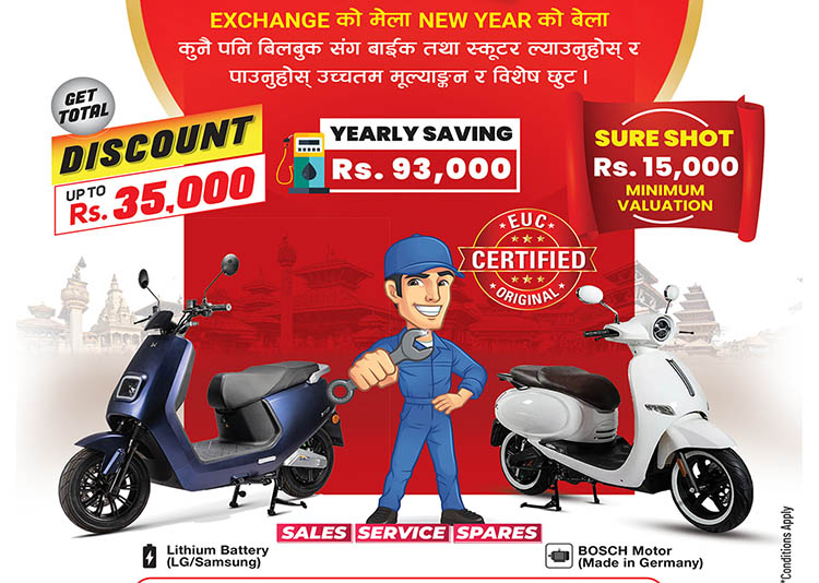 यो एक्सजेन्च मेलामा ग्राहकले कुनैपनि ब्राण्डका पुराना स्कुटर तथा मोटरसाइकलसँग लेभनिङका इलेक्ट्रीक स्कुटर एक्सचेन्ज गर्न सक्ने छन् ।