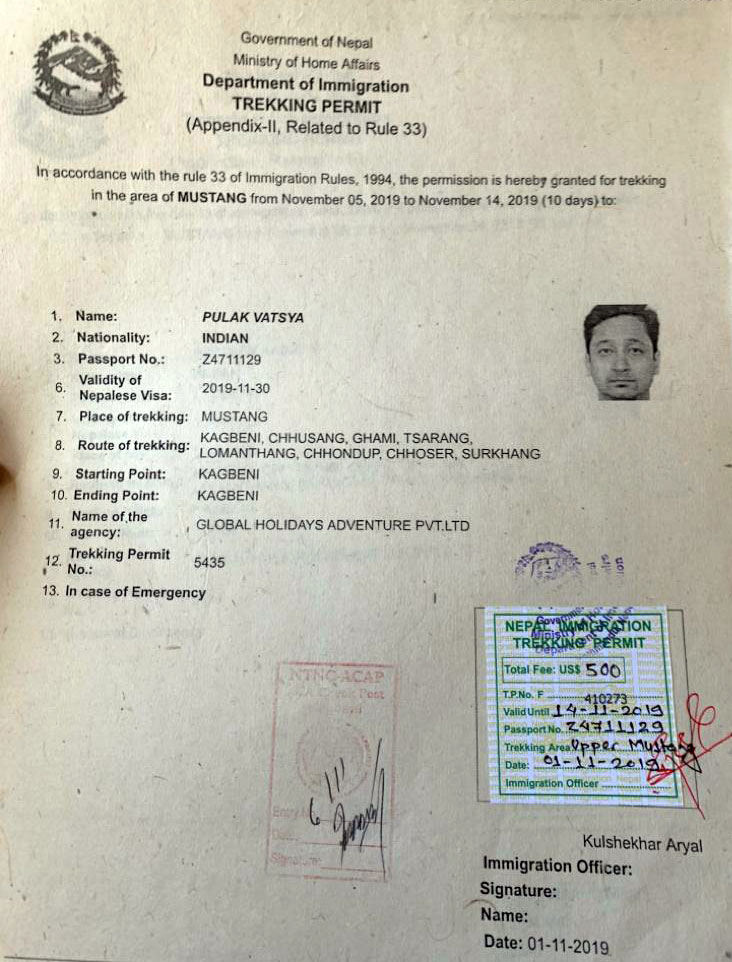 मुक्तिनाथको बासपछि अब हाम्रो यात्रा थियो । उपल्लो मुस्ताङ्गको अथेन्टिक मुस्ताङ्गको । जहाँ जानका लागि कागवेनीमा परमिट लिनु पर्ने रहेछ । जसको मूल्य विदेशी पर्यटकहरुका लागि ५०० डलर । मलाई त अचम्मै लाग्यो । नेपाल आउन भिषा शुल्क ३० देखि ५० डलर तर, अपर मुस्ताङ्ग जान ५०० डलर । अपर मुस्ताङ्गको यात्रा सारै अद्भुत । फेरिदै गएका पहाडका रङ्गहरु ।