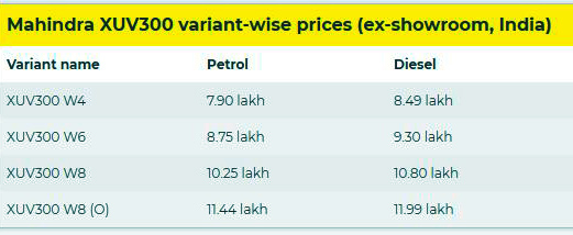 कम्पनीको एक्सयूभी–३०० डिजेल भेरियन्टमा डब्ल्यु–४, डब्ल्यु–६, डब्ल्यु–८ र डब्ल्यु–८ (अप्शनल) रहेको छ भने, पेट्रोल भेरीयन्टपनि डब्ल्यु–४, डब्ल्यु–६, डब्ल्यु–८ र डब्ल्यु–८ (अप्शनल) रहेको छ ।