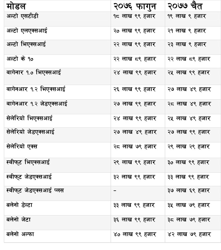 मारुती सुजुकी कम मूल्यका कारको लागि परिचित ब्राण्ड हो । कम्पनीले नेपाली बजारमा धेरै विक्री गर्ने मोडल भिटारा ब्रेजा, स्वीफ्ट, सेलेरियो, अल्टो, वागेनआर र बलेनो हो । यी मध्य भिटारा ब्रेजा नयाँ पेट्रोल इन्जिनमा आएकाले मूल्यको तुलनात्मक अध्यनमा यहाँ प्रस्तुत गरिएको छैन । ब्रेजा बाहेक मारुती सुजुकीले एउटा नयाँ भेरियन्ट स्वीफ्टमा थप गरेको छ । त्यसको नयाँ मूल्य टेवलमा देखाइएको छ ।