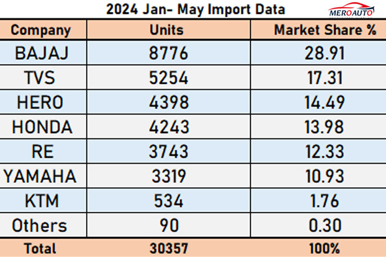 विगत तीन वर्षदेखि निरन्तर स्कुटरको आयात बढ्ने र मोटरसाइकलको आयात घट्ने क्रममा थियो । तर, सन् २०२४ को ५ महिनाको तथ्यांक अनुसार स्कुटरको तुलनामा मोटरसाइकलको आयात धेरै भएको छ । पाँच महिनाको अवधिमा २७ हजार ४६१ यूनिट स्कुटर आयात हुँदा ३० हजार ५०१ यूनिट मोटरसाइकल आयात भएको हो ।