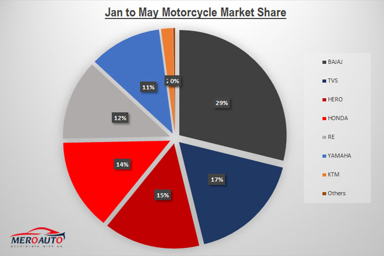 बजाजले पछिल्ला ५ महिनामा ८ हजार ७७६ यूनिट मोटरसाइकल ल्याएर पहिलो स्थानमा आफुलाई सुरक्षीत राखेको छ । यो मोटरसाइकल सेग्मेन्टमा २८.९१ प्रतिशत हो । बजाज मोटरसाइकल बिक्रीमा लामो समयदेखि नम्वर एक ब्राण्डको रुपमा स्थापित छ ।