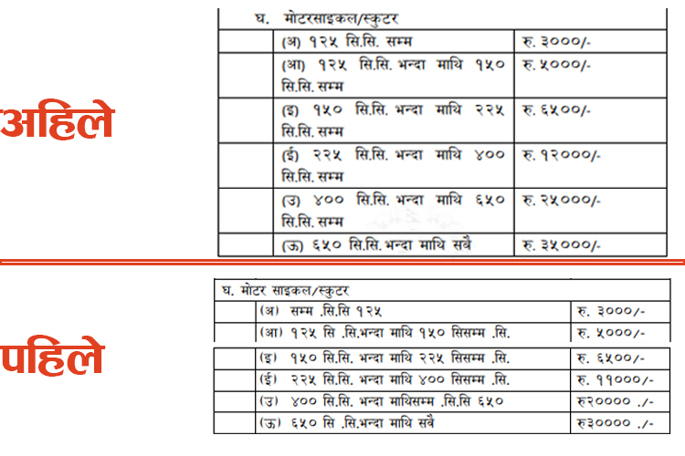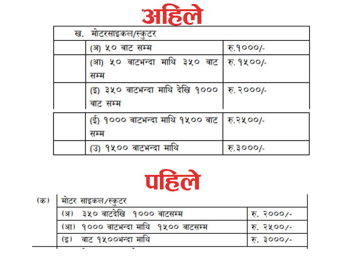 त्यस्तै, ४०० देखि ६५० सीसीसम्मका मोटरसाइकलमा लाग्दै आएको २० हजार र ६५० सीसीदेखि लाग्दै आएको ३० हजार वार्षिक करमा ५/५ हजारका दरले वृद्धि गर्दै क्रमश २५ हजार र ३५ हजार रुपैयाँ पुर्याइएको हो ।
