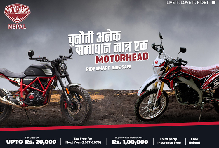काठमाडौं । मोटरहेड मोटरसाइकलको लागि नेपालको आधिकारिक वितरक एसएलआर टेक्नो एण्ड प्रालिले कोभिड १९ लक्षीत स्कीम सार्वजनिक गरेको छ । कम्पनीले नगद तथा अन्य छुटका अफर ल्याएको हो ।