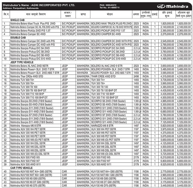 काठमाडौं । महिन्द्राको आधिकारीक वितरक अग्नी इनकर्पोरेट प्रालिले महिन्द्राका विभिन्न मोडलको मूल्य प्रकाशन गरेको छ । नाडा अटोमोवाइल्स एशोसिएसन अफ नेपालले आफ्ना सदस्यहरुको मूल्यसूची साउन ८ गते प्रकाशन गरेको थियो । त्यही मूल्यसूचीमा महिन्द्राका विभिन्न ४४ भेरियन्टको मूल्य प्रकाशन गरेको हो ।