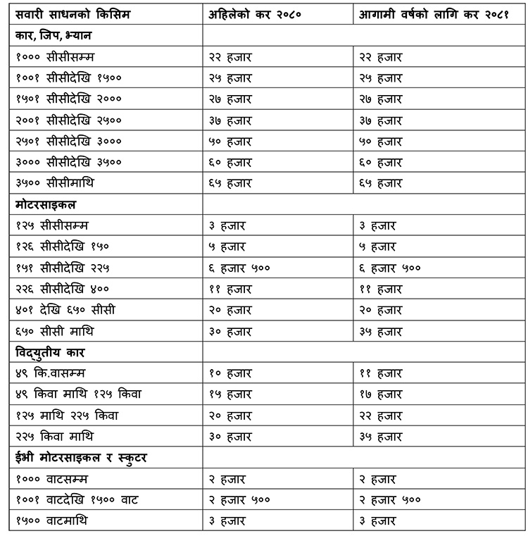 लुम्बिनी प्रदेशको आर्थिक ऐन २०८१/८२ मा विद्युतीय कारको मोटर पावरको आधारमा १ हजारदेखि ५ हजारसम्मले वार्षिक कर वृद्धि गरिएको हो । लुम्बिनीमा पनि पेट्रोल कार र मोटरसाइकलमा हरेक वर्ष बढ्दै आएको कर भने यस पटक स्थिर भएको छ ।