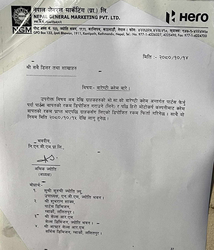 ‘वारेन्टीका सामान फेर्न आउने ग्राहकहरुको लागि अबदेखि कुन सामान वारेन्टीमा फेर्नु पर्ने हो, सोको लिस्ट बनाई पठाउने र उक्त लिस्टको सामान हिरोबाट हामीलाई प्राप्त भएपछि मात्र ग्राहकलाई वोरेन्टीको सामान दिइनेछ,’ कम्पनीले डिलरहरुलाई लेखेको पत्रमा भनिएको छ ।
