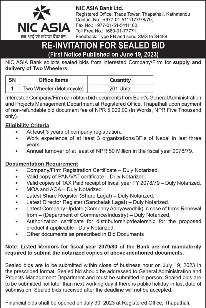 मोटरसाइकल बिक्री गर्न इच्छुक कम्पनीले थापाथलीमा रहेको एनआईसी एशिया बैंकको कार्यालयमा आवेदन दिन सक्नेछन् । आवेदन साउन तीन गतेसम्ममा पेश गरिसक्नु पर्ने बैंकले निकालेको सूचनामा उल्लेख छ ।