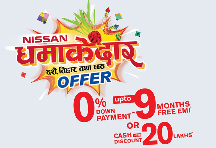 निसानको आधिकारीक वितरक पायोनियर मोटो कर्पले ‘निसान धमाकेदार दसैं, तिहार तथा छठ अफर’ उपहार योजना ल्याएको छ । उक्त योजना अन्तर्गत ग्राहकहरूले शुन्य प्रतिशत डाउन पेमेन्टमा गाडी खरिद गर्न सक्ने छन् ।