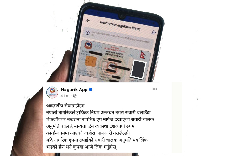 सरकारले नागरिक एपमार्फत देखाएको लाइसेन्स पनि मान्य हुने व्यवस्था गरेको हो । नागरिक एपले आफ्नो आधिकारिक फेसबुक पेजमार्फत अबदेखि एपमार्फत देखाएको लाइसेन्स मान्य हुने जानकारी गराएको हो ।