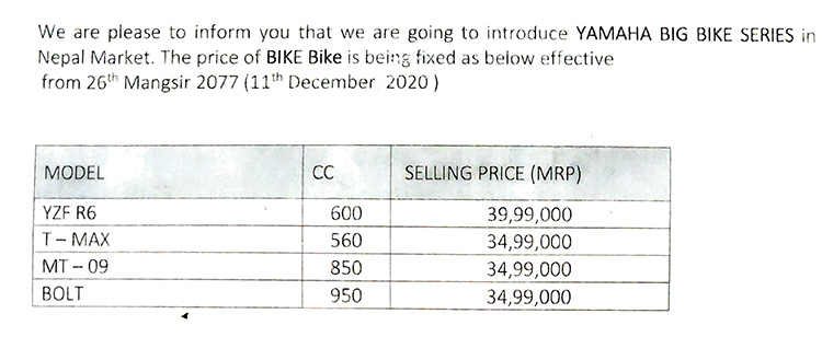 त्यस्तै यामाहाले ल्याउन लागेको अन्य मोडलमा वाइजेडएफ आर-६ को मूल्य ३९ लाख ९९ हजार, टी-म्याक्स ५६० को मूल्य ३४ लाख ९९ हजार र बोल्टको मूल्य ३४ लाख ९९ हजार रुपैयाँ निर्धारण गरेको छ ।