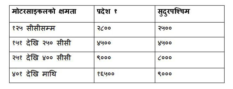 त्यसैगरि ४०१ सीसी माथिका मोटरसाइकलमा लाग्ने करमा सुदुरपश्चिम सरकार निकै उदार देखिएको छ । उसले यस्ता मोटरसाइकलमा ९ हजार रुपैयाँ कर लगाउदा प्रदेश १ सरकारले १६ हजार ५०० रुपैयाँ कर लगाएको छ ।