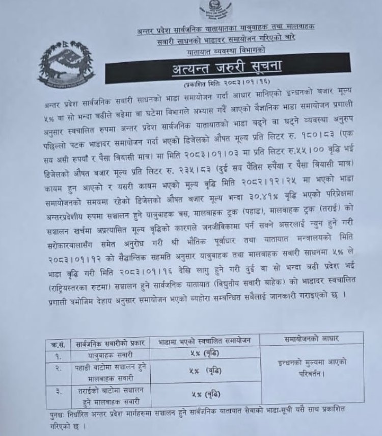 इन्धनको मूल्य वृद्धि भएको भन्दै यातायात व्यवस्था विभागले बुधबारदेखि लागू हुने गरी अन्तर प्रदेश संचालन हुने सार्वजनिक यातायातको भाडादर बढाएको हो ।