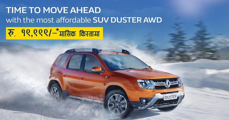 डिजेल इन्जिन सहितको अलह्वील ड्राइभ डस्टरको मूल्य ५९ लाख ९ हजार रुपैयाँ रहेको छ । अफरमा डस्टर किन्न चाहने ग्राहकले ५० डाउन पेमेन्ट अनिर्वाय गर्नु पर्ने हुन्छ । यसरी डाउन पेमेन्ट वापत २९ लाख ५४ हजार ५०० रुपैयाँ तिर्नु पर्ने हुन्छ । बाँकी २९ लाख ५४ हजार ५०० रुपैयाँ कर्जा लिनु पर्ने हुन्छ । उक्त कर्जा वापतको रकम ७ वर्षे अवधिमा भुक्तानी गर्नु पर्ने हुन्छ ।