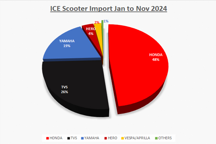 जनवरी २०२४ देखि नोभेम्बर २०२४ सम्ममा जम्मा ७२ हजार ९२५ यूनिट स्कुटर आयात भएको भन्सार तथ्यांकमा देखिन्छ । कुल आयात मध्ये होन्डाले ३५ हजार १३२ यूनिट स्कुटर आयात गरेको तथ्यांकले देखाउँछ । जुन कुल आयातको ४८ प्रतिशत हो ।