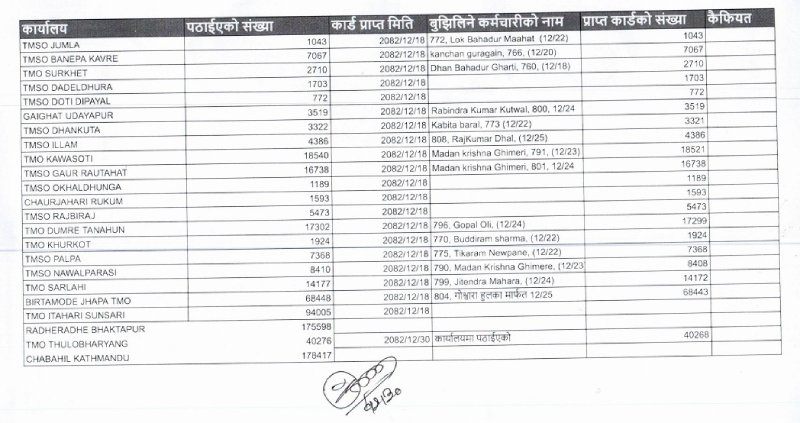 उनका अनुसार यातायात व्यवस्था कार्यालय जुम्ला, बनेपा, सुर्खेत, डडेलधुरा, दिपायल, उदयपुर, धनकुटा, इलाम, कावासोती, गौर, ओखलढुंगा, राजविराज, चौरजहारी, डुम्रे, खुर्कोट, पाल्पा, नवलपरासी, सर्लाही, झापा, सुनसरी, भक्तपुर, ठूलो भर्याङ र चाबहिलका सेवाग्राहीको लाइसेन्स पठाइएको हो ।