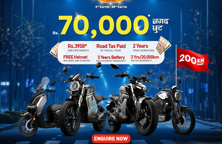 काठमाडौं । इलेक्ट्रीक स्कुटर कम्पनी सुपर शोकोले तिहार अफर ल्याएको छ । कम्पनीले तिहारको अवसरमा इलेक्ट्रीक मोटरसाइकल तथा स्कुटरमा ७० हजारसम्म नगद छुट दिने अफर ल्याएको हो ।
