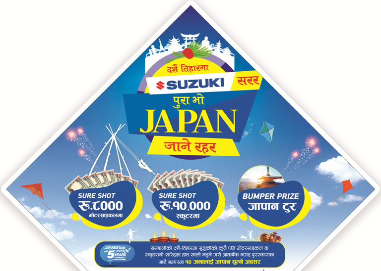 काठमाडौं । सुजुकी टु ह्वीलरको नेपाल को लागी आधिकारीक बितरक भी जी अटोमोबाइल्स प्रा लीले नयाँ फेस्टिभल अफर सार्वजनिक गरेको छ । कम्पनीले सुजुकी बाइक तथा स्कूटरमा ग्राहकहरुले नेपाल भरीको सुजुकी शोरुम बाट खरीद गर्दा बाइकमा ८००० र स्कुटरमा १०००० छुट हुने छ साथै बम्पर उपहार मा १० जनालाइ भाग्यशाली ग्राहकले लक्कीड्र मार्फत जपान जानपाउने छन्र । यो स्कीम २०७५ भाद्र २० गते बाट शुरु भएर २०७५ कार्तिक ३० गते सम्म लागू हुनेछ ।