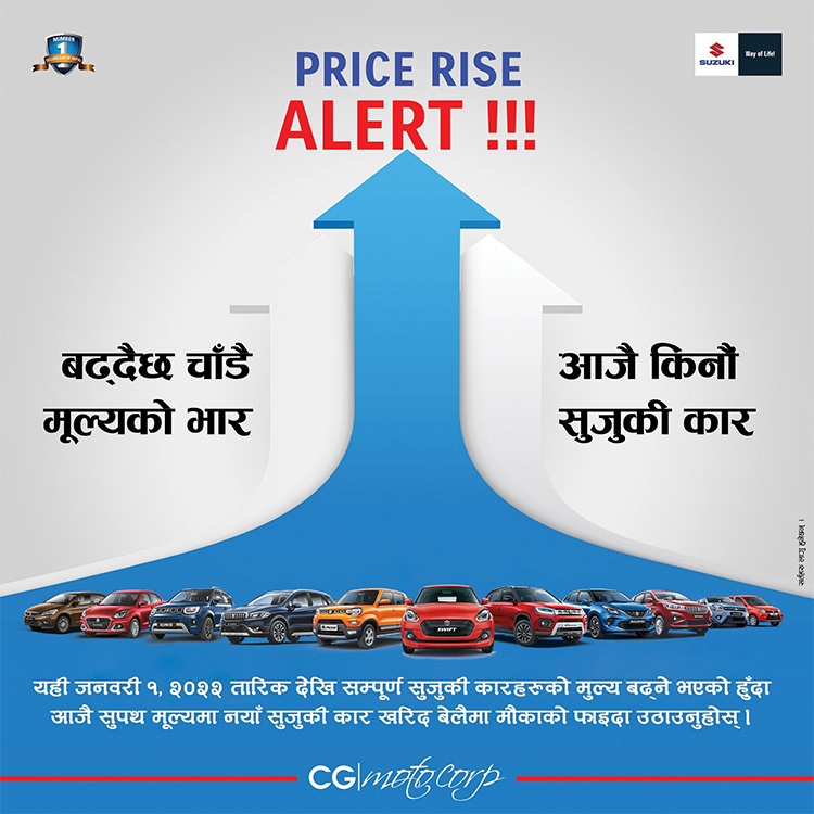 कम्पनीले सोसल मिडियामा ‘प्राइस राइज अलर्ट’ भनेर ग्राहकको लागि सुचना प्रबाह पनि गरेको छ । सोसल मिडियामा दिइएको सुचना अनुसार जनवरी १, २०२२ बाट सम्पूर्ण सुजुकी कारको मूल्य बढ्ने उल्लेख छ ।