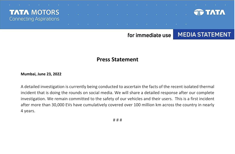 आगलागीको घटनापछि टाटा मोटर्सले एक बक्तब्य जारी गरेको छ । कम्पनीले कारमा आगलागीको कारण पत्ता लगाउन काम अगाडि बढाइएको जाउँदै भनेको छ, ‘अहिले हामी यसको कारण खोजी रहेका छौं । विस्तृत विवरण आउने वित्तिकै त्यसलाई सार्वजनिक गर्छौ ।’