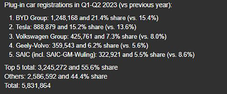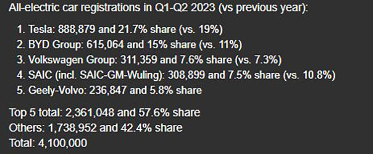 ‘ईभी-डाटा’ले सार्जजनिक गरेको तथ्यांक अनुसार सन् २०२३ को ६ महिनाको गाडी बिक्रीलाई आधार बनाउँदा टप ५ भित्र रहेका यी ब्राण्डले कुल ३२ लाख ४५ हजार २७२ यूनिट न्यू इनर्जी भेहिकल बिक्री गरेका छन् । जुन कुल बिक्री ५८ लाख ३१ हजार ८६४ यूनिटको ५५.६ प्रतिशत हो ।