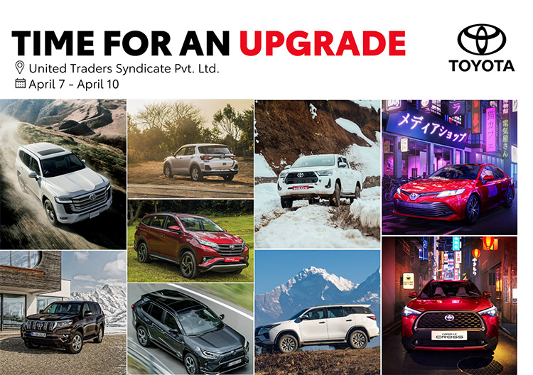 काठमाडौं । नेपालका लागि टोयोटाको आधिकारिक वितरक युनाइटेड ट्रेडर्स सिन्डिकेट प्रालिले नयाँ वर्ष २०७९ को उपलक्ष्यमा ग्राहकलाई अपग्रेड गर्न सहयोग गर्ने उद्देश्यले ‘टाइम फर एन अपग्रेड’ स्कीम ल्याएको छ ।
