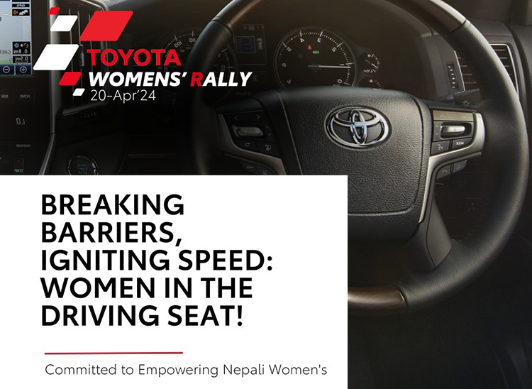 टोयोटा गाडीको नेपालका लागि आधिकारिक बिक्रेता युनाइटेड ट्रेडर्सले आगामी वैशाख ८ गते मोटर र्याली आयोजना गर्न लागेको हो । उक्त र्यालीको उद्देश्य अटोमोटिभ क्षेत्रका महिलाहरू माझ सौहार्द्रता र साहसिक भावनाको प्रवद्र्धन गर्नु रहेको कम्पनीले जनाएको छ ।