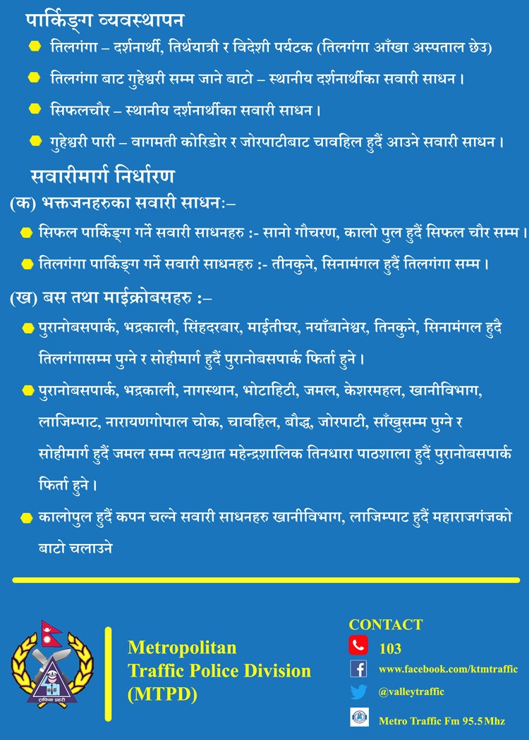 काठमाडौं । महाशिवरात्रीको दिन पशुपति क्षेत्रमा लाग्ने विशेष मेलालाई मध्यनजर गर्दै उपत्यका ट्राफिक प्रहरी कार्यालयले विभिन्न नाकाबाट गौशाला प्रबेश गर्ने सवारीसाधनलाई रोक लगाएको छ ।