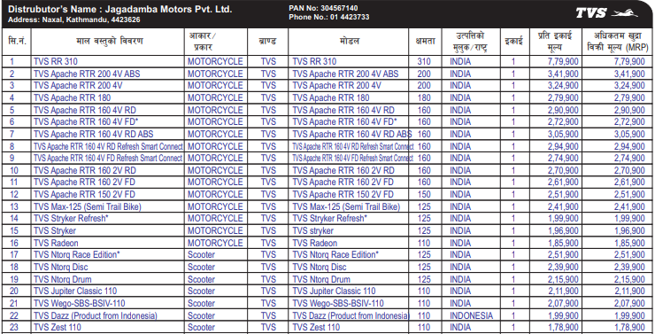 कार्तिक २५ गते प्राशित नयाँ मूल्यसूचीमा जगदम्वा मोटर्सले विक्री गर्ने टीभीएसका विभिन्न ८ मोडलका मोरसाइकल र ५ मोडलका स्कुटरगरि जम्मा २३ भेरियन्टका मोटरसाइकल तथा स्कुटरको मूल्य समावेश रहेको छ ।