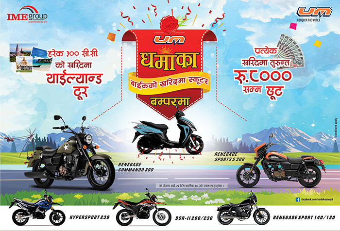 काठमाडौं । नेपालका लागी युएम बाइकको अधिकारिक विक्रेता आइएमई अटोमोटिभसले “युएम बाइकको धमाका अफर” नामक योजना सावृजनिक गरेको छ ।