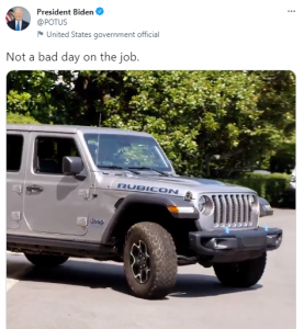 ‘आजको दिन खराब थिएन ।’ त्यसको केही समयपछि सिल्भर कलरको फोरडोर र्‍याङगलरलाई हर्न बजाएर चलाइरहेको भिडियो पोस्ट गर्दै ७८ वर्षीय वाइडेनले ट्विटरमा लेखे । हेर्नुहोस्, उनको ट्विटर पोस्ट ।