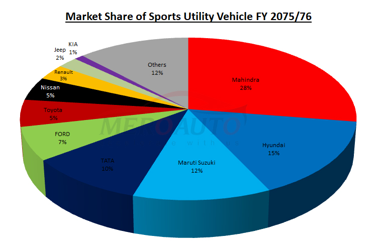नेपाली बजारमा आर्थिक वर्ष २०७५/७६ मा सबैभन्दा धेरै यूटिलीटी भेइकल बिक्री गर्ने कम्पनी महिन्द्रा भएको छ । कम्पनीले बिक्री गर्दै आएको चर्चित एसयूभी स्कोर्पियो, बलेरो, एक्सयूभी ५०० र टीयूभी ३०० जस्ता गाडीले कुल एसयूभीको २८ प्रतिशत बजार हिस्सा ओगटेको छ । महिन्द्राको आधिकारीक वितरक अग्नी इन्कर्पोरेटले यूटिलीटी भेइकलको रुपमा २ हजार २६८ यूनिट गाडी आयात गरेको तथ्याङ्कले देखाएको छ ।