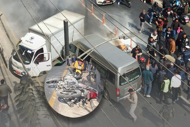 बागमती प्रदेश ००४ क ५३८१ नम्बरको माइक्रो भ्यान, बागमती प्रदेश ०२-०५६ प ३९६७ नम्बरको स्कुटर र एउटा मोटरसाइकल एक आपसमा ठोक्किएका हुन् ।
