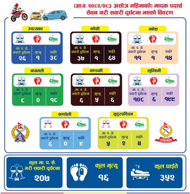 नेपाल प्रहरीको तथ्यांक अनुसार असोजमा महिनामा मापसे गरेका चालकले सवारी चलाउँदा देशभर २०७ वटा दुर्घटना भएका छन् । तीमध्ये आधा बढी लुुम्बिनी प्रदेशमा रहेको प्रहरीको तथ्यांक छ ।