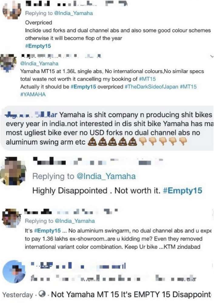 फिचरमा कम्पनीले कन्जुस्याइ गरेको र मूल्य धेरै राखिएको भन्दै एमटी–१५ लाई इम्पीटी–१५ भन्दै सोसल मिडियामा ट्रोल सुरु गरिएको हो ।