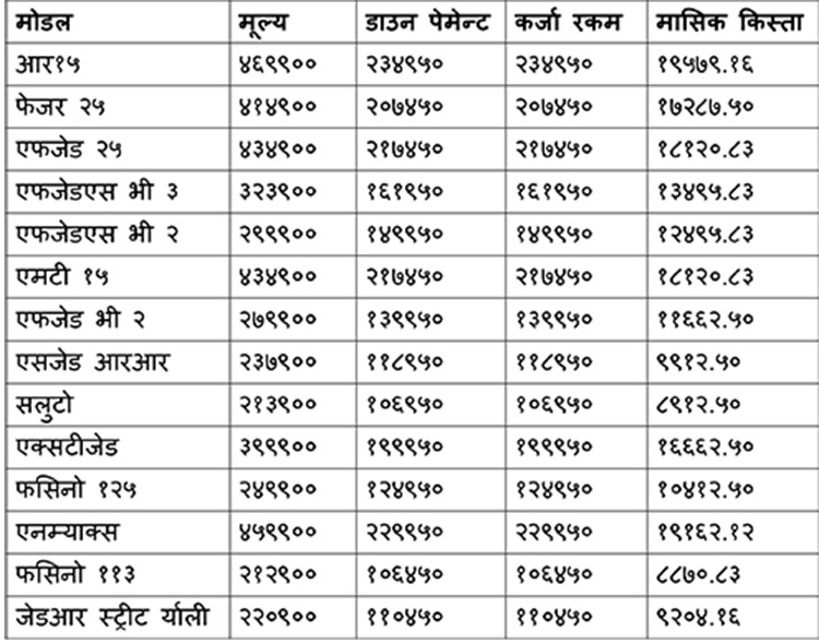 यस्तो छ सबै मोडलको नयाँ मूल्य अुनसारको मासिक किस्ता